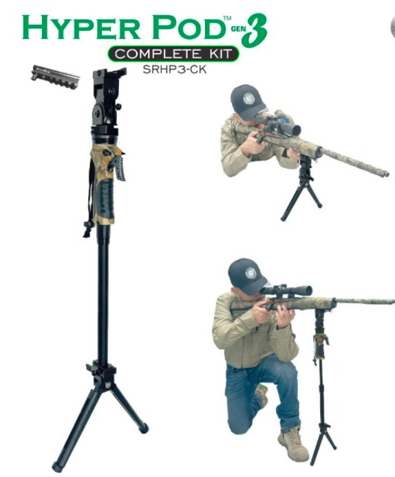 The Hyper Pod 3 is designed to allow for mobile hunting and the ability to shoot accurately with fast set up time. When deployed it allows a shooter to get in position and shoot within seconds. It also allows carriage while walking around ether on the firearm or in hand when detached. The shooter can shoot standing with Hyper Pod 3 tucked into the hip, kneeling with the Hyper Pod 3 on the ground, or sitting with Hyper Pod 3 on the ground.